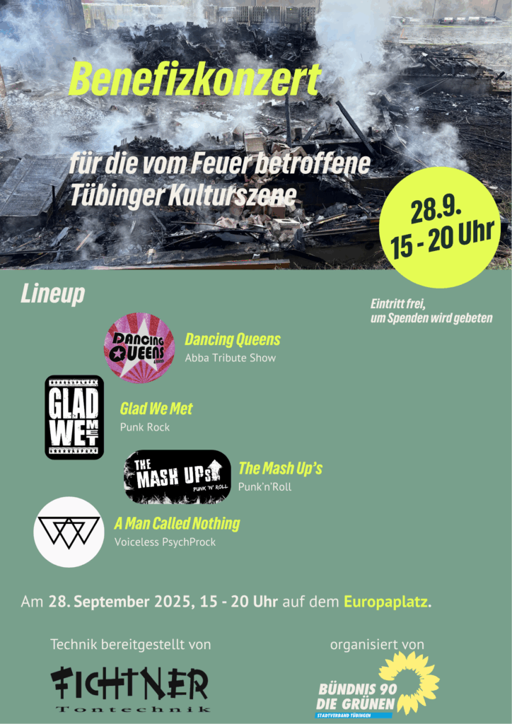 In der Nacht vom 08./09. April 2025 zerstörte ein Großbrand bei Hornbach in Tübingen vier Proberäume und zwei Tonstudios, die von etwa 20 Kulturschaffenden genutzt wurden. Neben dem großen Sachschaden in den neu eingerichteten Tonstudios (hoher sechstelliger Betrag), ist der Schaden für die Tübinger Kulturszene durch den Verlust der Infrastruktur und ohnehin schon knappen Probemöglichkeiten noch weitaus größer. Dem möchte der Tübinger Stadtvorstand zusammen mit Asli Kücük, Fichtner Tontechnik und verschiedenen Kunstschaffenden mit einem Benefizkonzert entgegenwirken. Die Tübinger Bands DANCING QUEENS, GLAD WE MET, THE MASH UP’S und A MAN CALLED NOTHING treten bei freiem Eintritt auf. Spenden sind erwünscht und gehen direkt an die Kunstschaffenden.